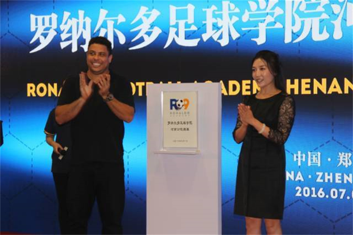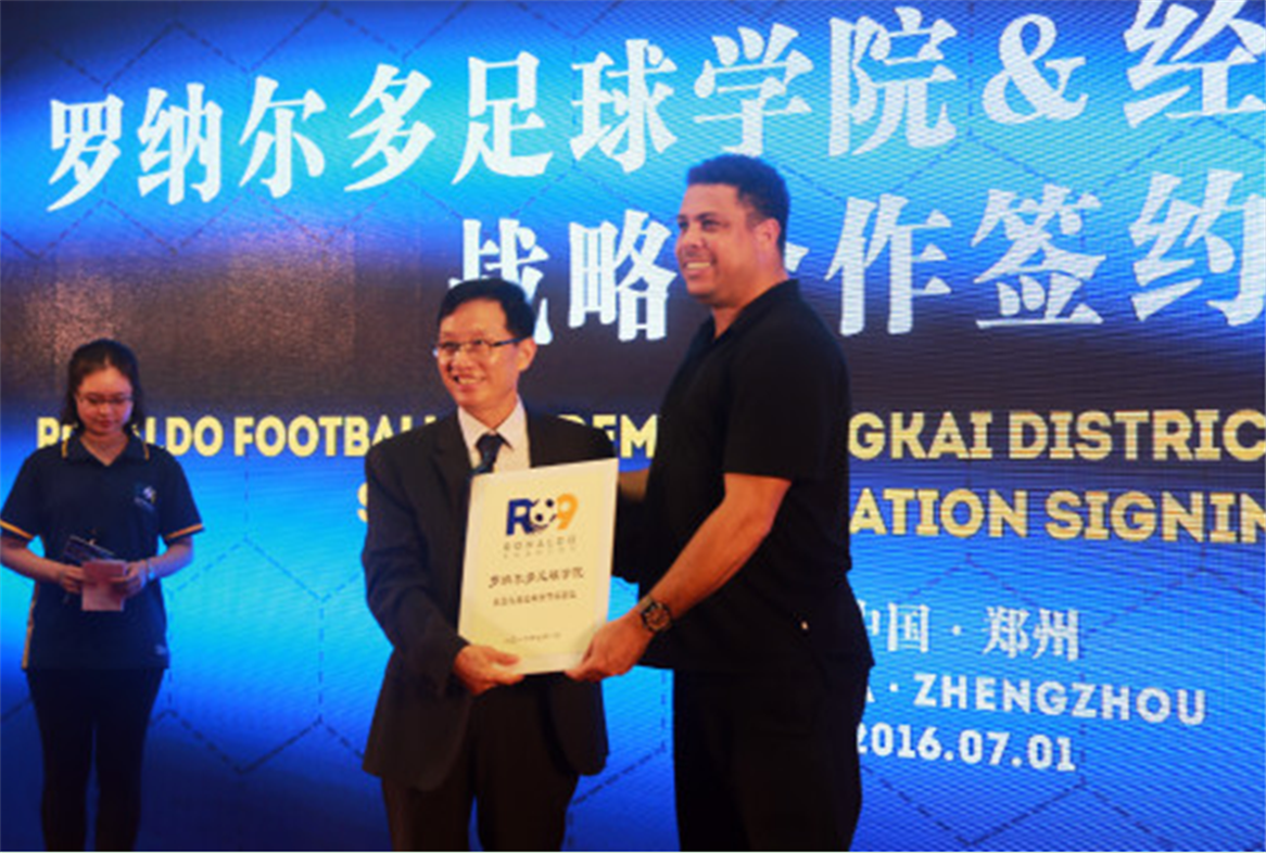 2016年7月1日,“外星人”羅納爾多空降鄭州?!巴庑侨恕绷_納爾多為羅納爾多足球學院河南分院授牌,并與現場球迷、學生親切互動。在羅納爾多本人的見證下羅納爾多足球學院河南分院院長郭紅星與鄭州經開區教文體局局長唐保華簽署了羅納爾多足球學院與鄭州經開區教文體局校園足球戰略合作協議,并一起為羅納爾多足球學院校園足球戰略合作實驗區揭牌。河南省副省長張廣智、河南省教育廳副廳長刁玉華、河南省體育局副局長王鵬、鄭州市副市長劉東,鄭州經開區黨工委書記崔紹營、河南省教育廳體衛藝處處長郭蔚蔚等省市領導共同見證了這一時刻。