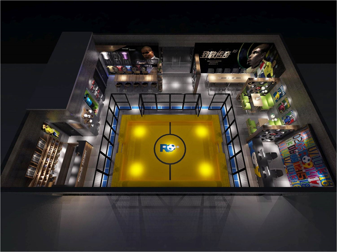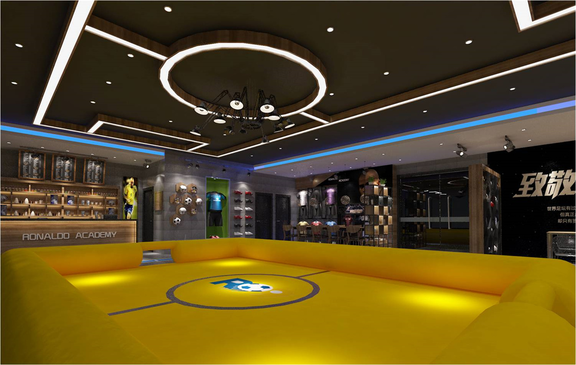 此次由勤略品牌設計機構擔綱規劃設計的羅納爾多足球學院體驗中心,在總體規劃布局上合理劃分了七大功能區。為了滿足室內足球的訓練及體驗等功能,以中心球場為主,環繞式的劃分了:接待區、咨詢洽談區、外教辦公區、投影教學區、休閑水吧、顧客更衣室,商品陳列被靈活的穿插進所有的功能區。