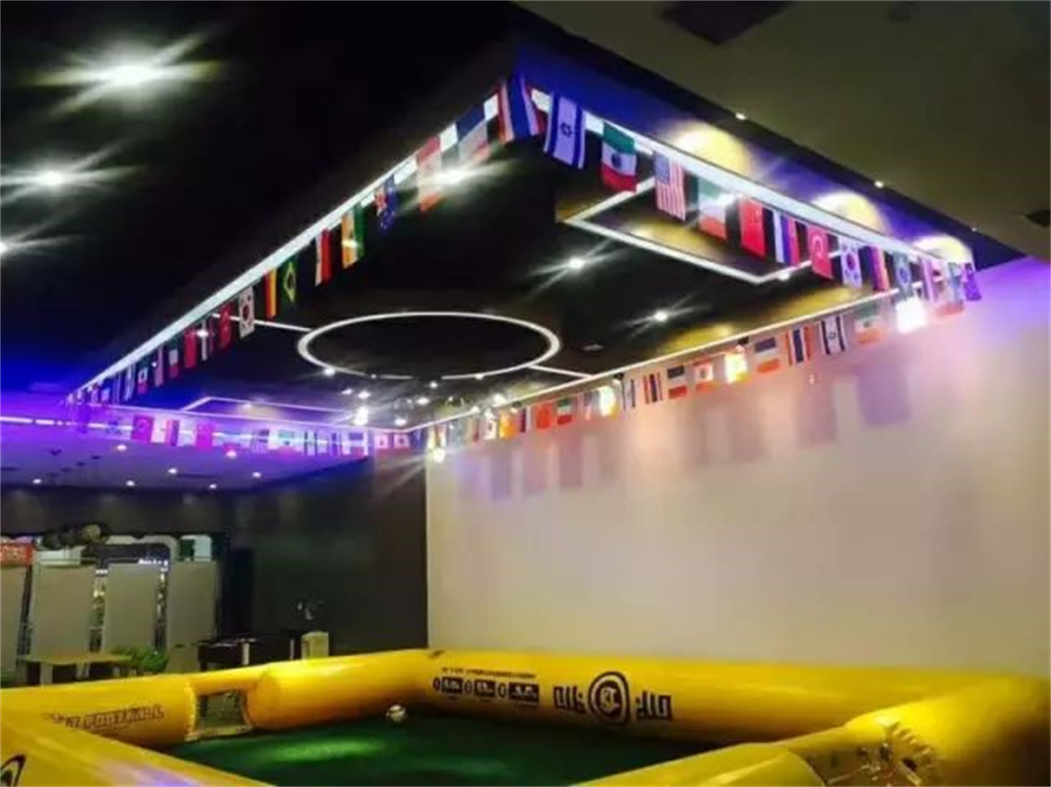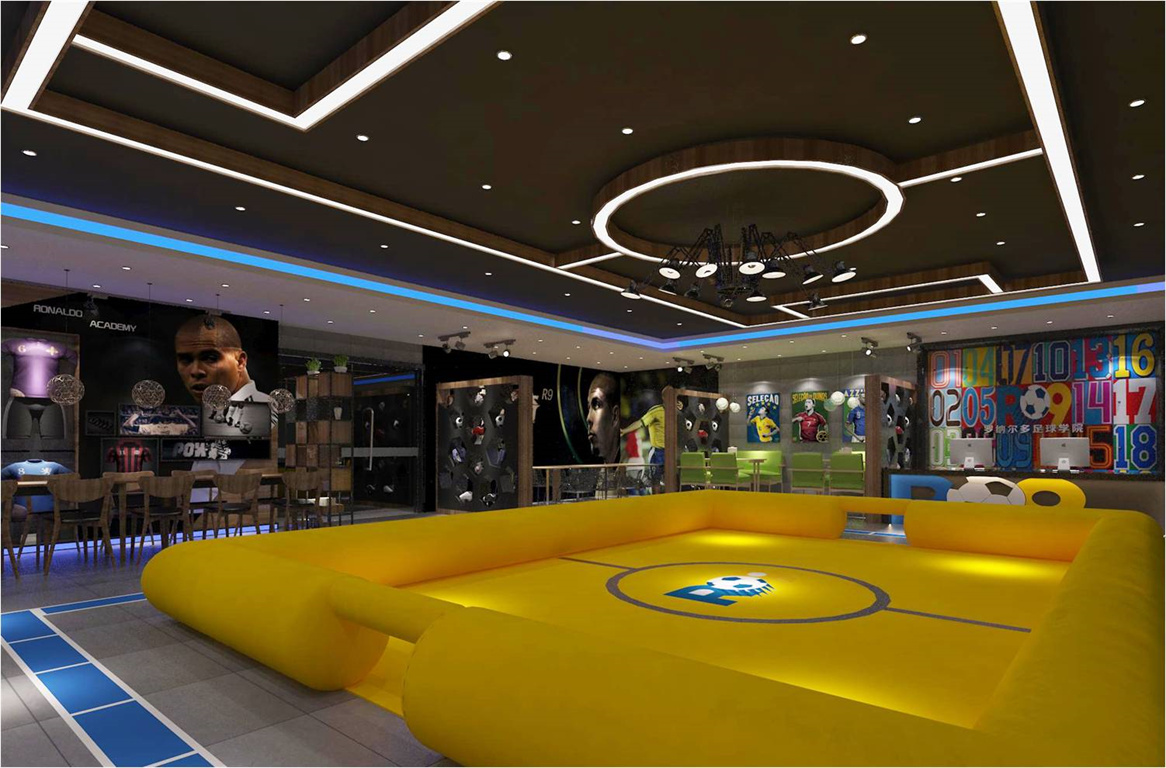 在各區域造型上,做了極大的考究,通過燈光的設計,材料的巧妙運用,把視覺中心集中在了球場區域,外圍的6大功能區的造型點到為止,避免喧賓奪主。以灰的包容性,來協調、抵消7大區域所帶來的沖突,空間中融入了高清室內羅納爾多寫真,烘托球場氣氛,以金杏木紋,為空間添加一些溫暖感,穩重感,舒適感。