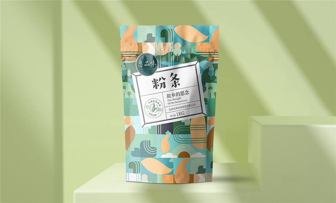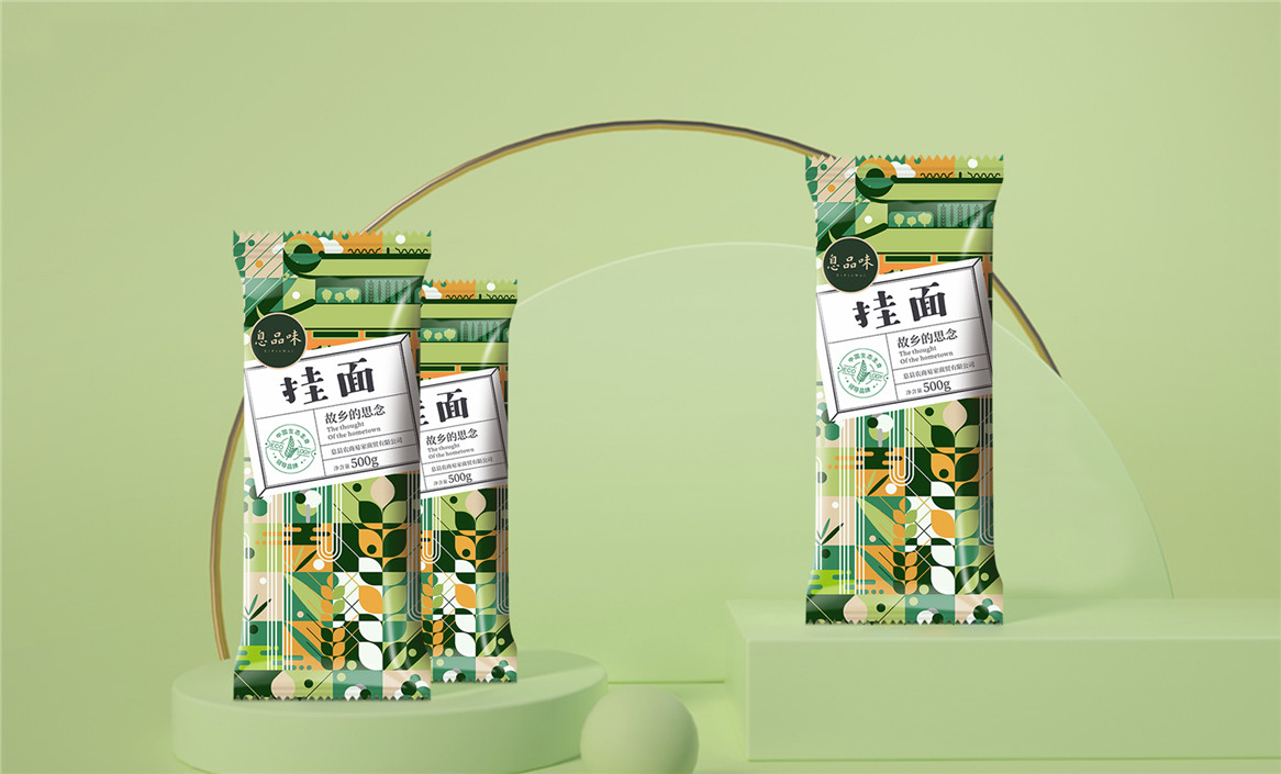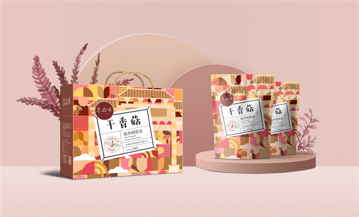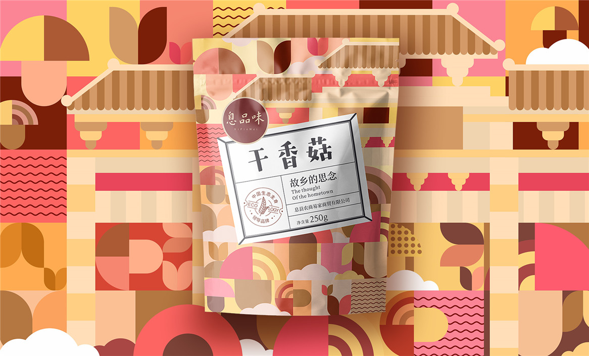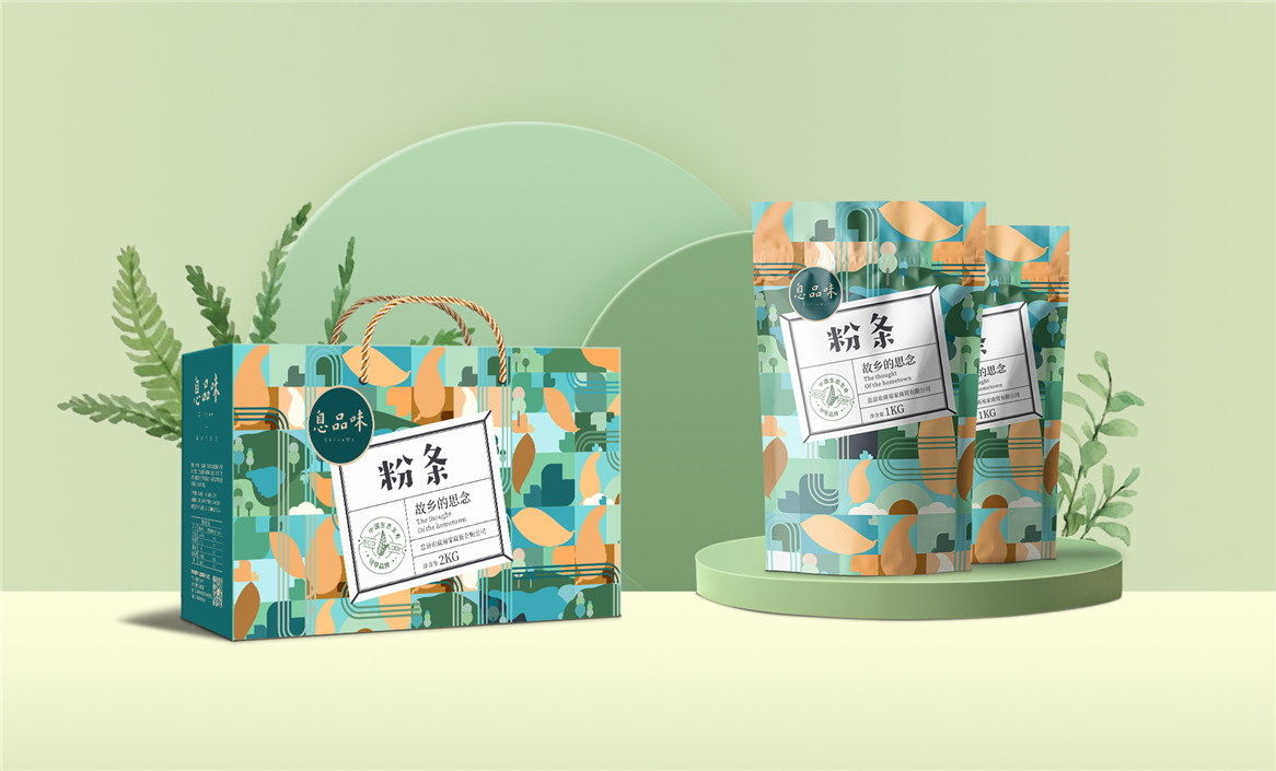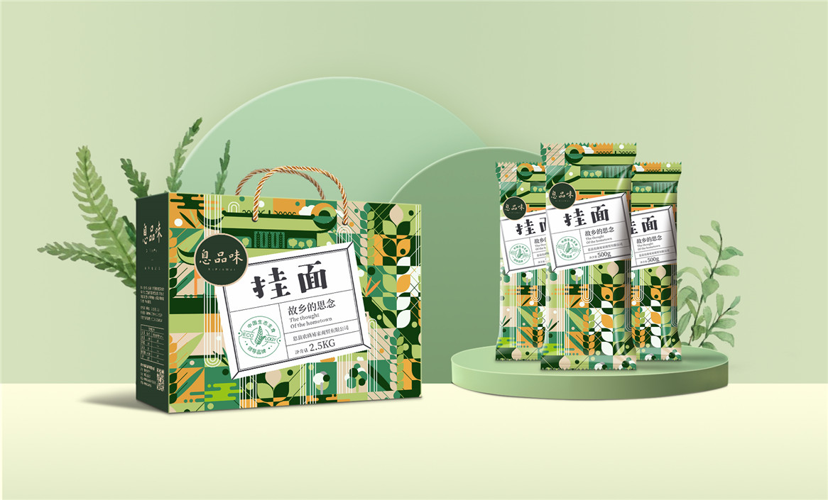 以“故鄉(xiāng)的思念”為品牌溝通語言,從息品味產(chǎn)品生態(tài)特征,地域代表文化、當?shù)孛袼酌耧L等提取包裝設計元素,以平面幾何形態(tài)的方式把產(chǎn)品、產(chǎn)地、相關文化特征進行符號化設計視覺表達,用一種與當下農(nóng)副產(chǎn)品市場不同的包裝表現(xiàn)方式設計,展現(xiàn)綠色新生活,迎合當下消費升級審美升級的新消費趨勢,快速建立品牌認知。