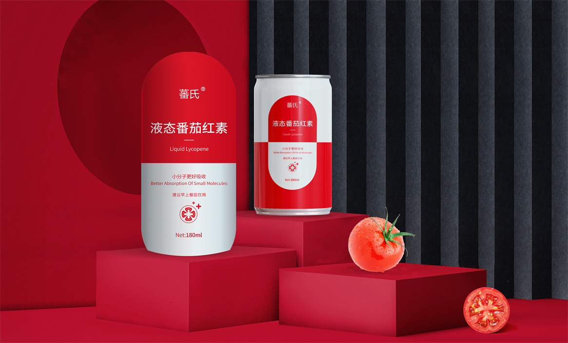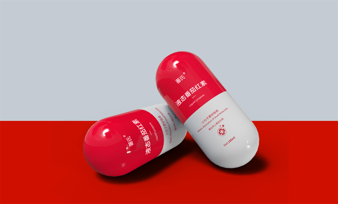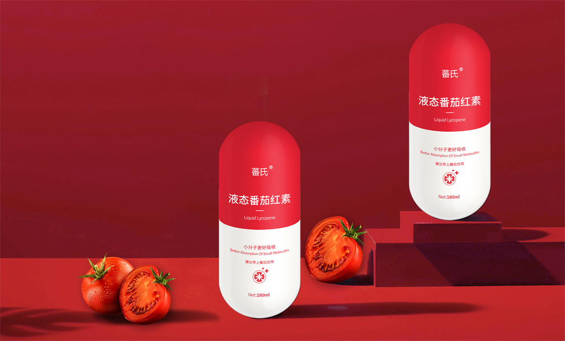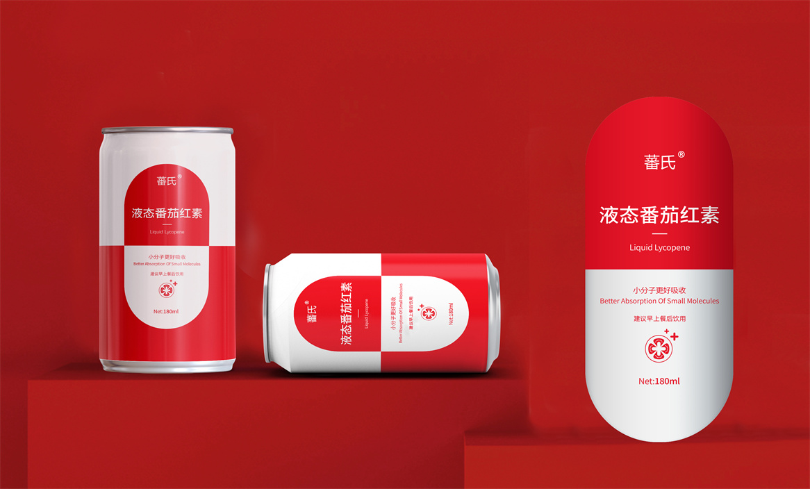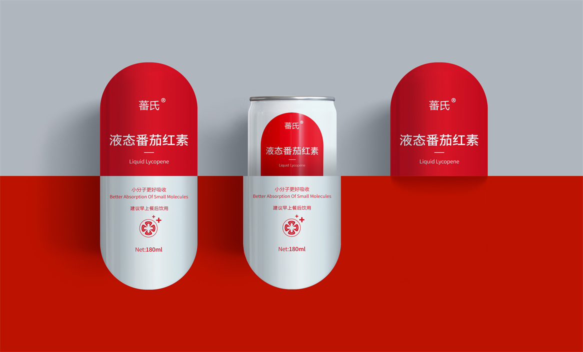 基于品牌策略暨功能性保健飲品的定位和對標產品,分別從產品原材料番茄和對標產品番茄紅素膠囊中提取功能性認知和記憶符號:膠囊和加號。借助人們的對番茄紅素膠囊的認知嫁接于液態番茄紅素,借助人們對醫療符號的認知強調產品及功能性。產品即營銷,產品包裝設計就是要通過包裝傳遞產品價值,塑造品牌認知的超級符號。