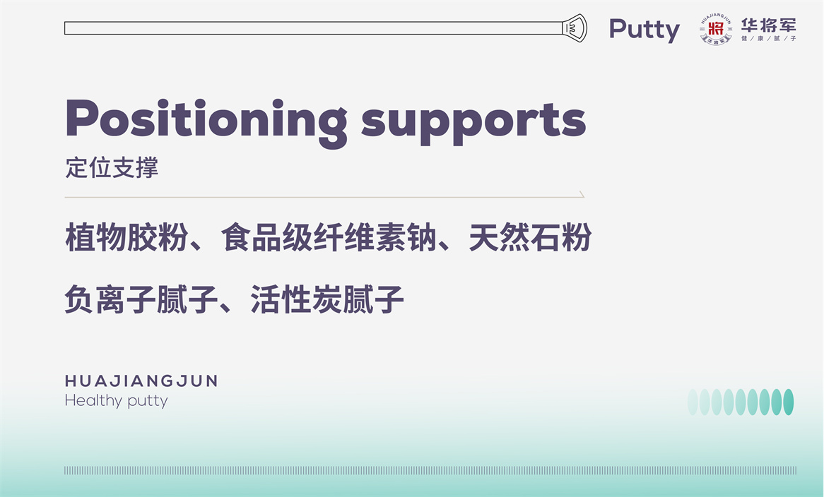 “追求完美品質,讓產品更環保健康,更人性化”是華將軍的品牌追求,因此華將軍堅持甄選優質源材,從選材至成品全程嚴苛把控,使用“棉花、玉米、山藥、紅薯“等為膠粉,研發出了純天然的植物膩子系列;使用與乳制品同級的食品級纖維素鈉,推出可清除甲醛的負氧離子膩?子粉,全面提升膩子的安全環保系數。