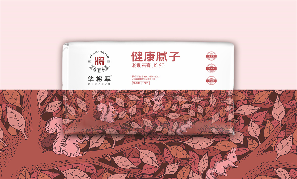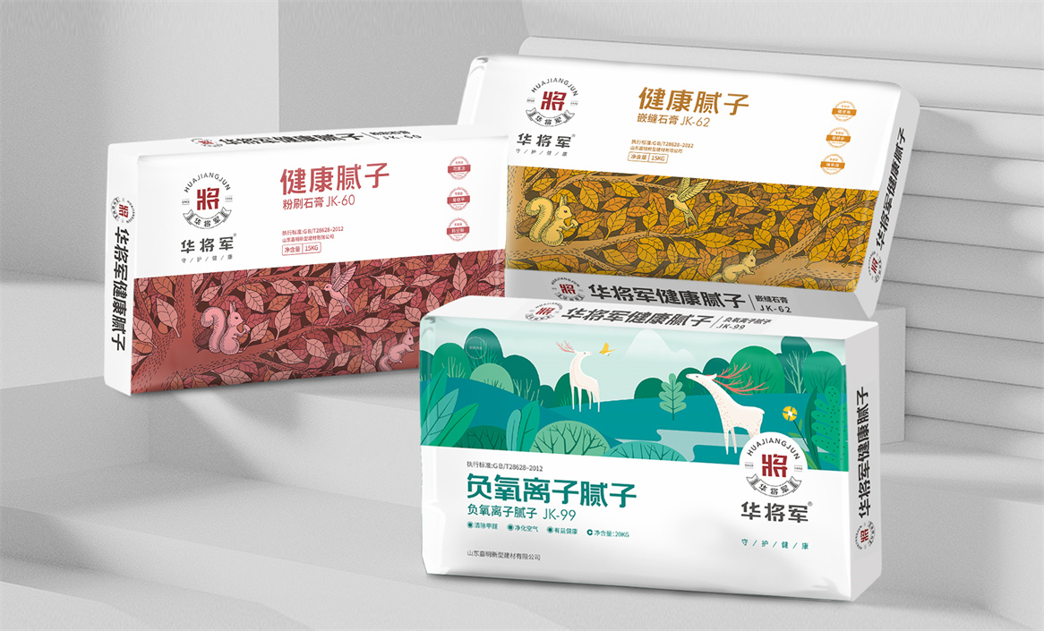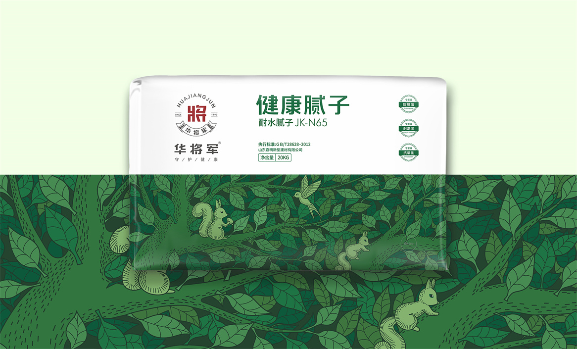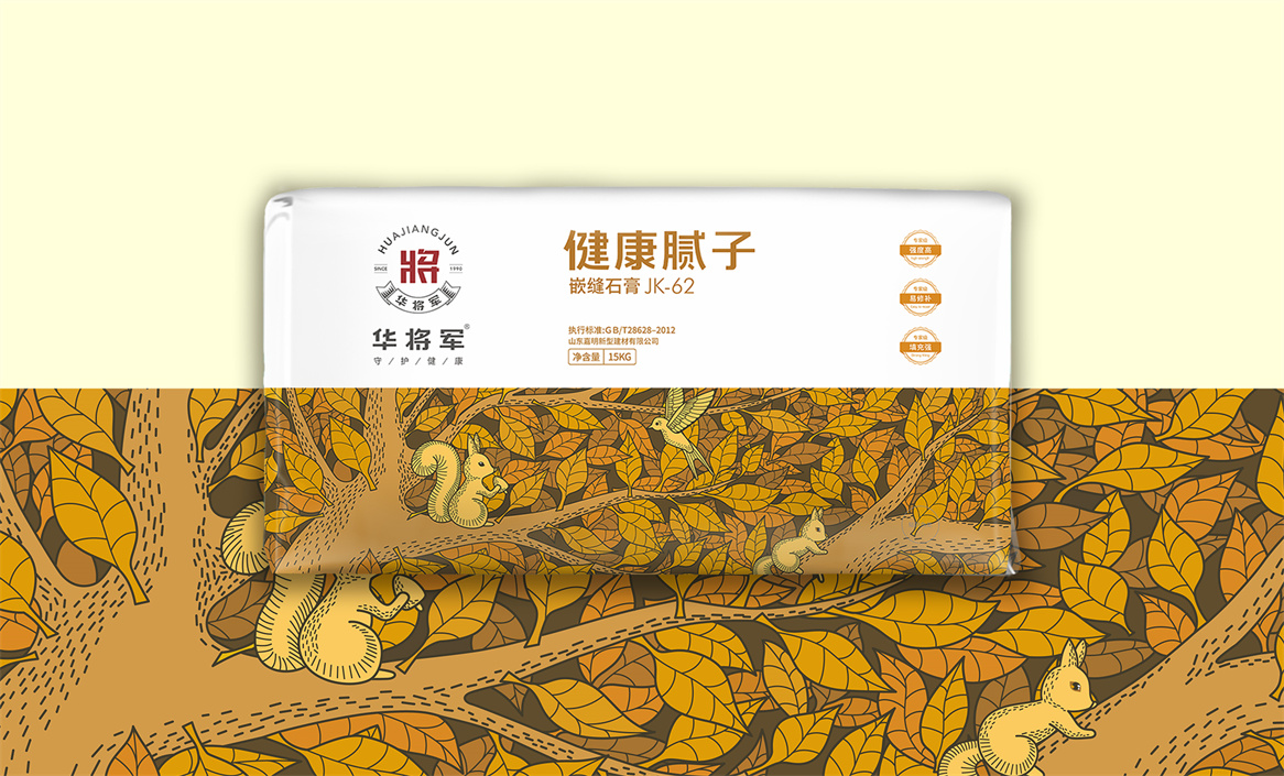 華將軍膩子粉包裝設計依據品牌和產品規劃,以中?端生態健康膩子為導向設計與眾不同。首先從包材上用高品質的環保紙袋代替了塑料編織袋;其次從版式上創新的使用橫版設計區別于市面上豎版包裝;再就是能夠直觀的視覺表達品牌和產品策略,設計上我們手繪了枝繁葉茂的大樹、森林以及對環境要求極高的動物和諧共生的場景,恰當直觀的表達了生態健康的核心理念。