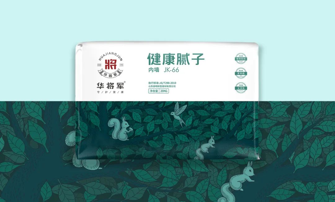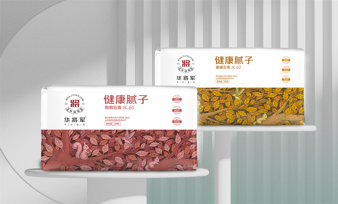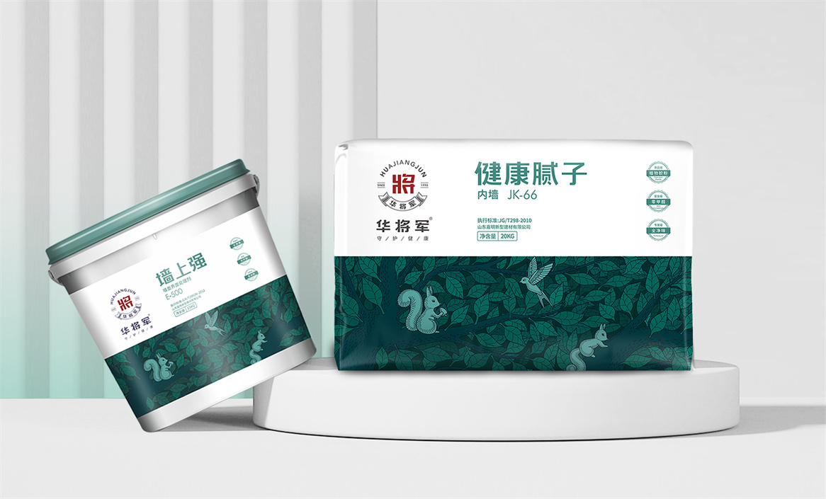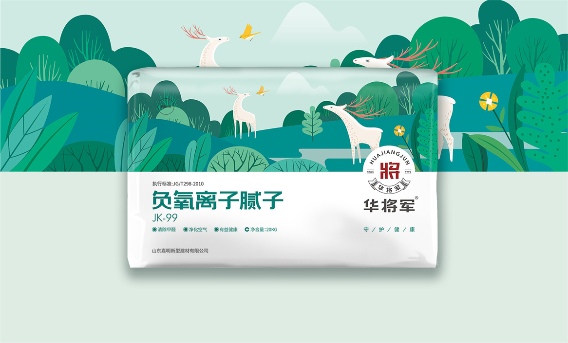 華將軍膩子粉包裝設計依據品牌和產品規劃,以中?端生態健康膩子為導向設計與眾不同。首先從包材上用高品質的環保紙袋代替了塑料編織袋;其次從版式上創新的使用橫版設計區別于市面上豎版包裝;再就是能夠直觀的視覺表達品牌和產品策略,設計上我們手繪了枝繁葉茂的大樹、森林以及對環境要求極高的動物和諧共生的場景,恰當直觀的表達了生態健康的核心理念。