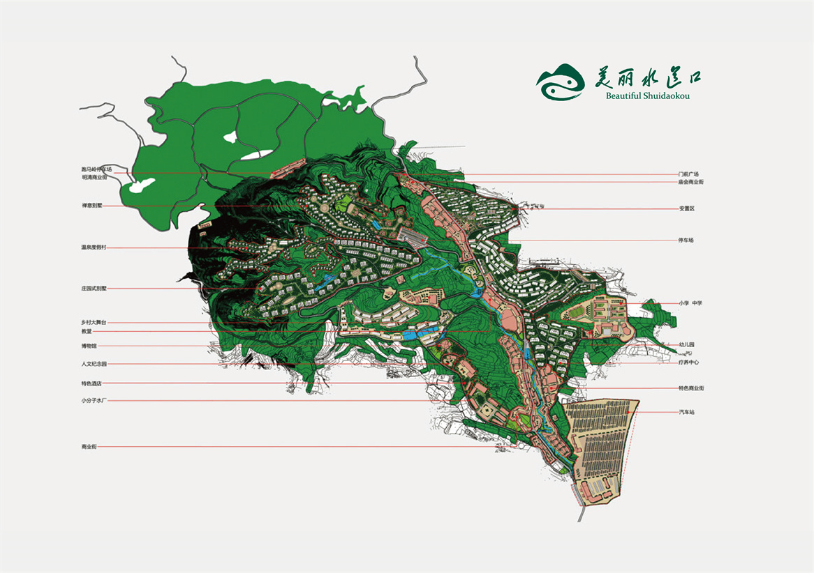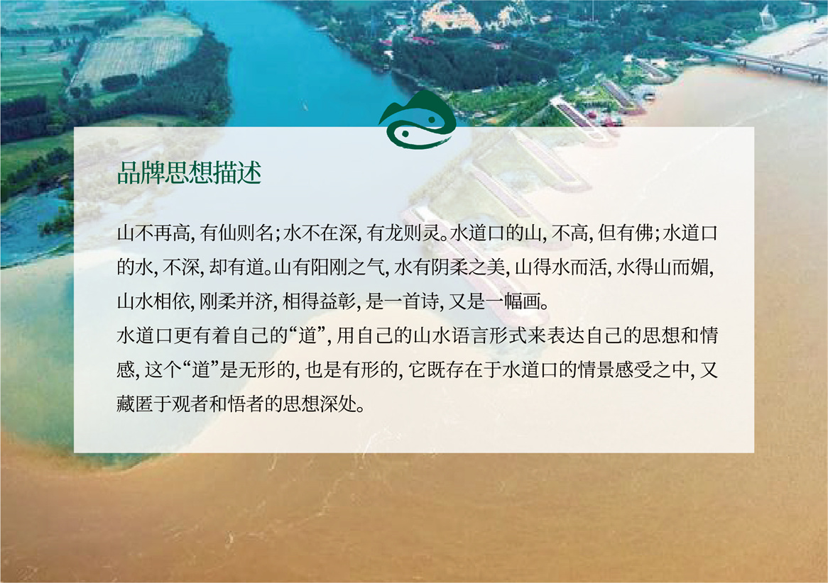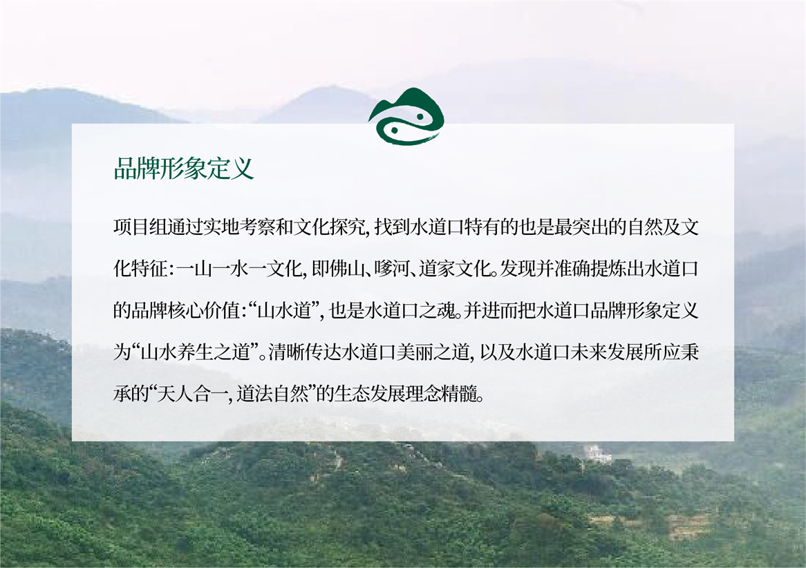項目組通過實地考察和文化探究,找到水道口特有的也是最突出的自然及文化特征:一山一水一文化,即佛山、云溪河、道家文化。發現并準確提煉出水道口的品牌核心價值:“山水道”,也是水道口之魂。并進而把水道口品牌形象定義為“山水養生之道”。清晰傳達水道口的美麗之道,以及水道口未來發展所應秉承的“天人合一,道法自然”的生態發展理念精髓。