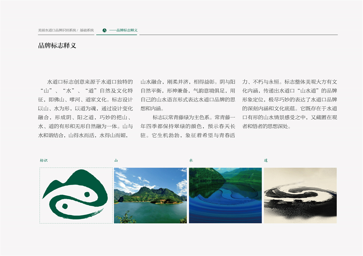 水道口標志設計創意來源于水道口獨特的“山”、“水”、“道”自然及文化特征,即佛山、云溪河、道家文化。品牌標志設計以山、水為形,以道為魂,通過設計變化融合,形成陰、陽之道,巧妙的把山、水、道的有形和無形自然融為一體。山與水和諧結合,山得水而活,水得山而媚,山水融合,剛柔并濟,相得益彰。陰與陽自然平衡,形神兼備,氣韻意境俱足,用自己的山水語言形式表達水道口品牌的思想和內涵。