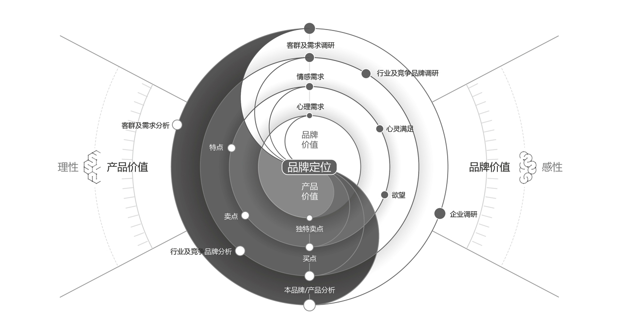 品牌是產品之上的一種情感認同,因價值而存在,因思想而傳承。品牌策劃是一個為品牌找魂的過程,找到能體現消費者欲望的、企業可滿足的、同時未被滿足的品牌核心價值定位。一個完整的品牌策劃,必須先由表及里,層層挖掘,直至核心,找到其獨特的核心價值,然后基于競爭在消費者的心智中恰當的品牌定位,再圍繞品牌定位由內而外準確的思想表達,將品牌核心價值語言化,滿足需求,創造欲望。