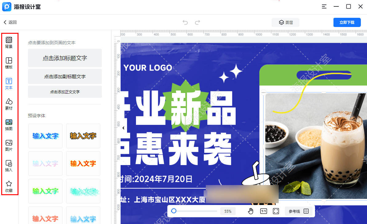 豐富的素材庫:它提供了大量可編輯和移動的貼紙、邊框和背景供我們使用,能夠增加海報的趣味性和個性。