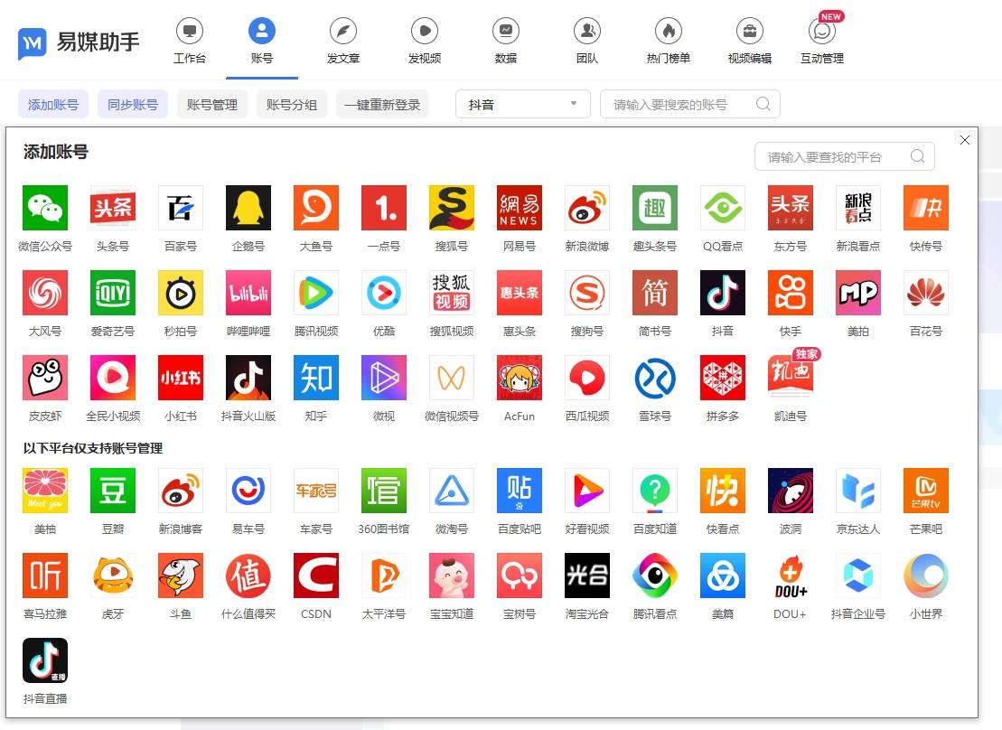 為了提高抖音矩陣營銷的運營效率,可以選擇一款專業的自媒體管理軟件。在這里,我向大家推薦易媒。易媒是一款支持70+自媒體矩陣管理、內容多平臺一鍵發布的軟件。它可以幫助您輕松管理1000+賬號,實現圖文、視頻、動態的批量發布,節省大量運營時間。