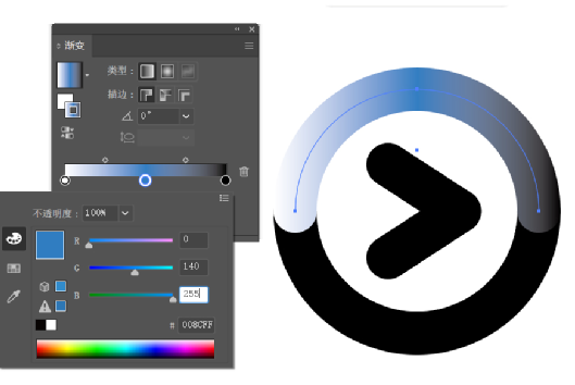 6.基本圖形制作完成后,就要進行上色操作了,大家跟上步驟了吧!① 用“選擇工具”選擇上半圓,在工具欄中選擇描邊,然后選擇漸變顏色。② 彈出的顏色和漸變編輯面板。描邊顏色也變成漸變色。
