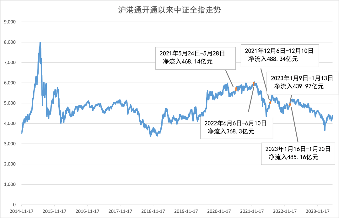 我們統(tǒng)計出了2014年11月17日滬港通開通以來截止2024年4月30日,北向資金凈流入金額最大的5個月份,發(fā)現(xiàn)買在高點的時候好像比較多。