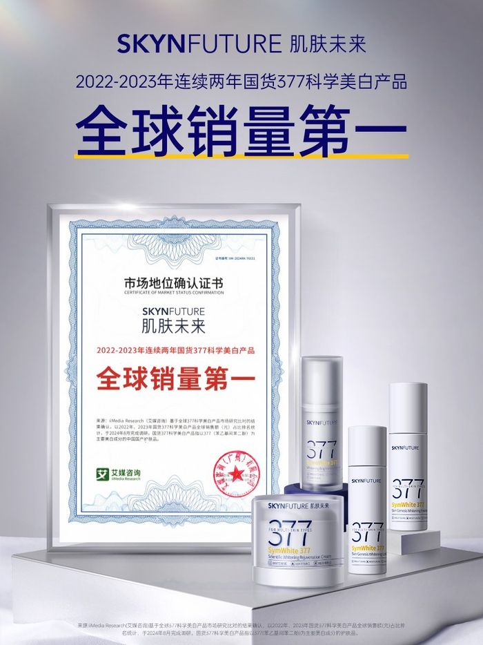 基于艾媒自主研發并獲得省部級重大科技專項立項的CMDAS大數據系統檢查及嚴格的調查,2024年8月,肌膚未來獲全球新經濟產業第三方數據挖掘和分析機構iiMedia Research(艾媒咨詢)授予的“377科學美白全球領軍品牌“與“2022-2023年連續兩年國貨377科學美白產品全球銷量第一”雙項市場地位確認。