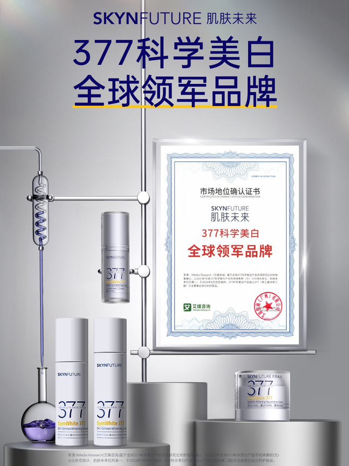 作為科學美白專研品牌,肌膚未來一直致力于研發適合亞洲女性肌膚的美白產品,品牌通過不斷的技術創新和產品升級,成功推出了以377為核心的全系列科學美白產品,該系列以其強大的美白力和溫和的使用體驗,獲得了市場的認可和消費者的青睞。