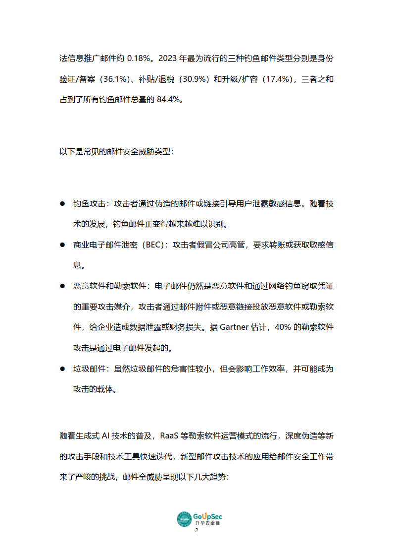 釣魚攻擊:攻擊者通過偽造的郵件或鏈接引導用戶泄露敏感信息。隨著技術的發展,釣魚郵件正變得越來越難以識別。商業電子郵件泄密(BEC):攻擊者假冒公司高管,要求轉賬或獲取敏感信息。惡意軟件和勒索軟件:電子郵件仍然是惡意軟件和通過網絡釣魚竊取憑證的重要攻擊媒介,攻擊者通過郵件附件或惡意鏈接投放惡意軟件或勒索軟件,給企業造成數據泄露或財務損失。據Gartner估計,40%的勒索軟件攻擊是通過電子郵件發起的。垃圾郵件:雖然垃圾郵件的危害性較小,但會影響工作效率,并可能成為攻擊的載體。隨著生成式AI技術的普及,RaaS等勒索軟件運營模式的流行,深度偽造等新的攻擊手段和技術工具快速迭代,新型郵件攻擊技術的應用給郵件安全工作帶來了嚴峻的挑戰,郵件全威脅呈現以下幾大趨勢: