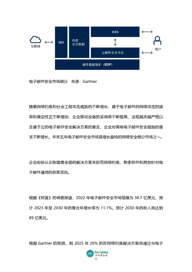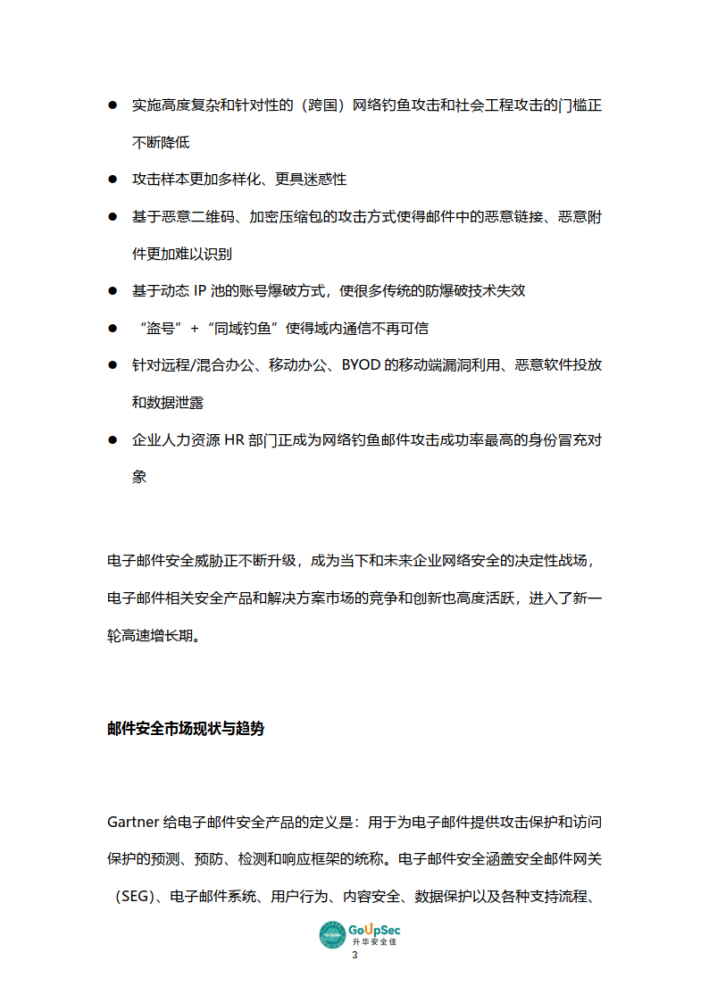 實施高度復雜和針對性的(跨國)網絡釣魚攻擊和社會工程攻擊的門檻正不斷降低攻擊樣本更加多樣化、更具迷惑性基于惡意二維碼、加密壓縮包的攻擊方式使得郵件中的惡意鏈接、惡意附件更加難以識別基于動態IP池的賬號爆破方式,使很多傳統的防爆破技術失效“盜號”+“同域釣魚”使得域內通信不再可信針對遠程/混合辦公、移動辦公、BYOD的移動端漏洞利用、惡意軟件投放和數據泄露企業人力資源HR部門正成為網絡釣魚郵件攻擊成功率最高的身份冒充對象電子郵件安全威脅正不斷升級,成為當下和未來企業網絡安全的決定性戰場,電子郵件相關安全產品和解決方案市場的競爭和創新也高度活躍,進入了新一輪高速增長期。