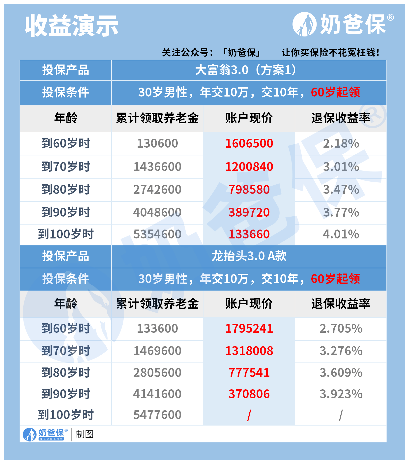 以30歲男性,年交10萬,交10年,60歲開始領取年金,看看這兩款產品的收益情況。